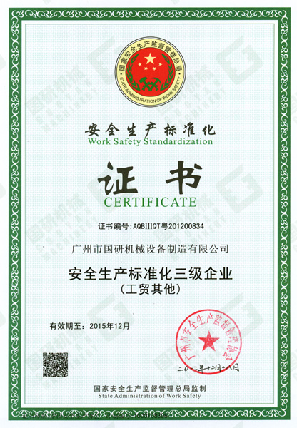 2012年12月24日,国家安全生产监督管理总局为华体会体育公司颁发了《安全生产标准化企业证书》,这意味着我司已达到《广州市工业企业安全生产标准化评定办法》及《广州市工业企业安全生产标准化评定标准》的要求。