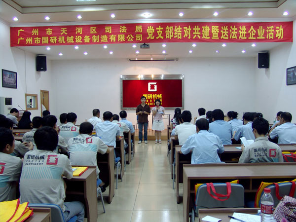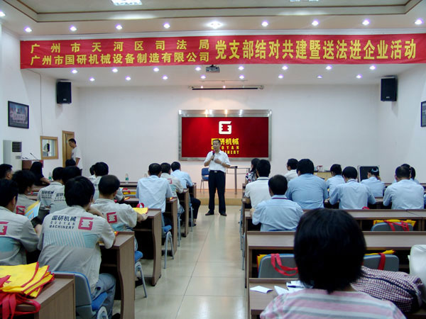 9月7日下午,广州市天河区司法局党支部和文教工作队一行18人在局长罗育辉和副局长曾晓云的带领下,来到广州市华体会体育设备制造有限公司举行党支部结对共建暨送法进企业活动。