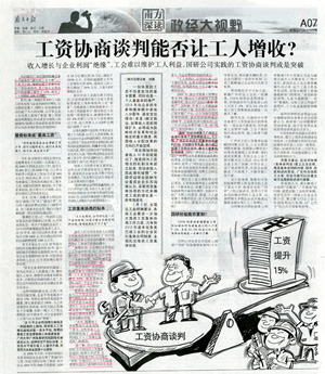 7月14日,《南方日报》以《工资协商谈判能否让工人增收?——国研公司实践的工资协商谈判或是突破》为题,用三分之二大版篇幅报道广州市华体会体育设备制造有限公司实践工资集体协商的成功经验。